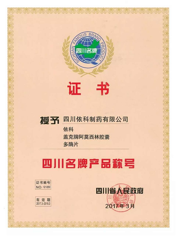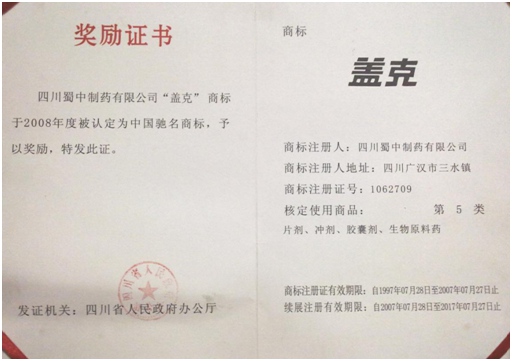 公司高度重视品牌战略,依法注册了“盖克”、“蜀中”、“三星堆”、“阿莫锋”、“益善源”、“蓉通”、“麻花豆电影高清”等108件注册商标,1999年“盖克”、2003年“蜀中”、2007年“三星堆”被认定为德阳市知名商标,2001年“盖克”、2004年“蜀中”被认定为四川省著名商标, 2008年“盖克”商标被国家工商行政管理总局认定为“中国驰名商标”。2017年3月,公司盖克牌、麻花豆电影高清牌阿莫西林胶囊和多酶片被四川省人民政府授予四川名牌产品称号。2016年,公司实现营业收入66373万元,利税7600万元;2017年,公司实现营业收入75045万元,利税7572万元。公司2017年被命名为德阳市第七批院士专家工作站,2016-2018连续三年被德阳市人民政府确定为重点龙头企业。